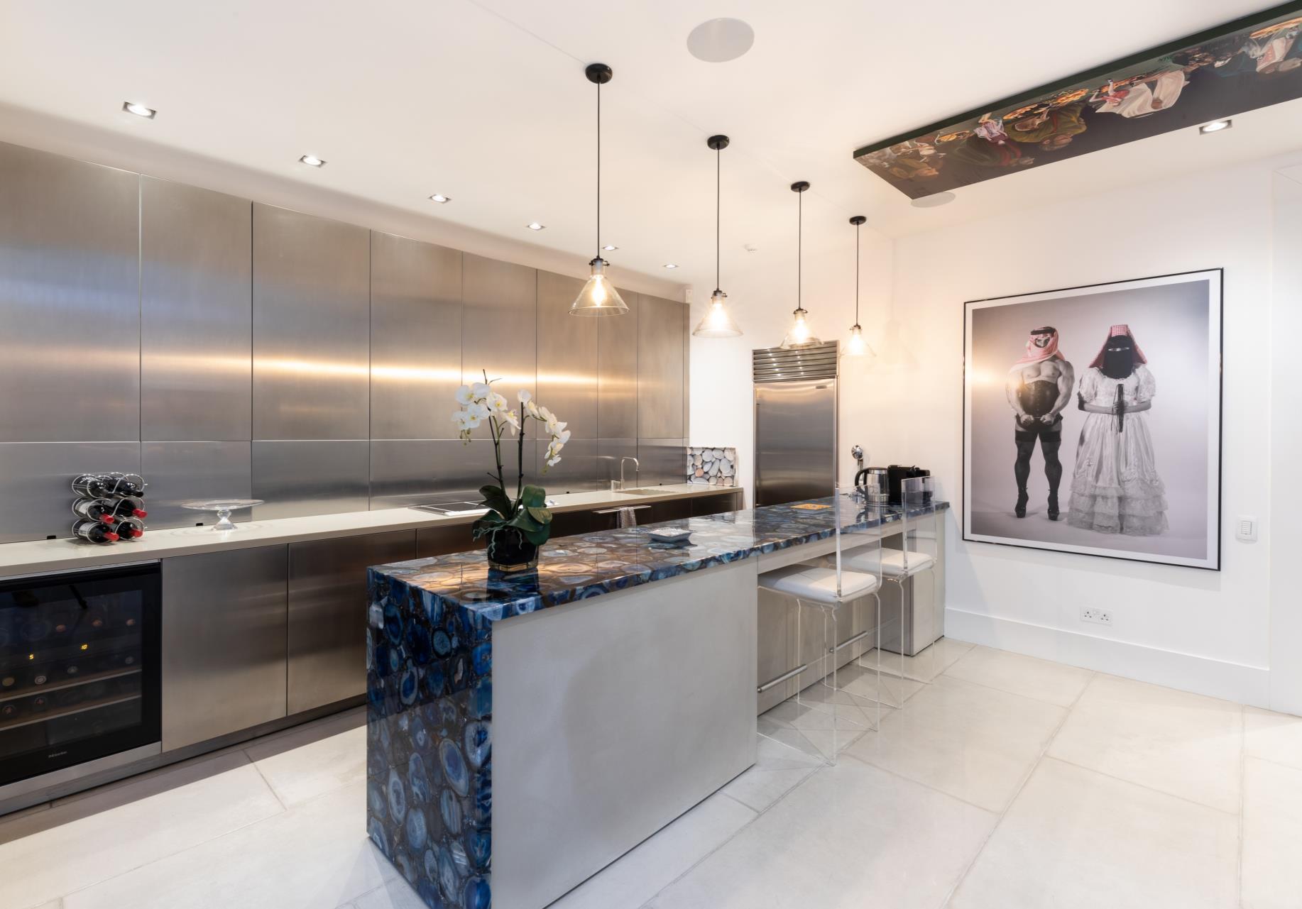 By the dining area, white and neutrals are the king and queen. However, this outstanding design corner only works with the white and blue-tiled sideboard. The kitchen countertop was a challenge for its size as it’s entirely made of blue agate crystal, which we had made and flown from India to London. Besides, with hand-painted-tiles, Boca do Lobo Heritage sideboard has gained a privileged place in this room dictating an overall look and feel about this unique space. In this project, Laith Abdel Hadi worked closely with his clients to create an interior design project that reflects the clients’ style and personality, always pushing the boundaries of style and design a bit further.
