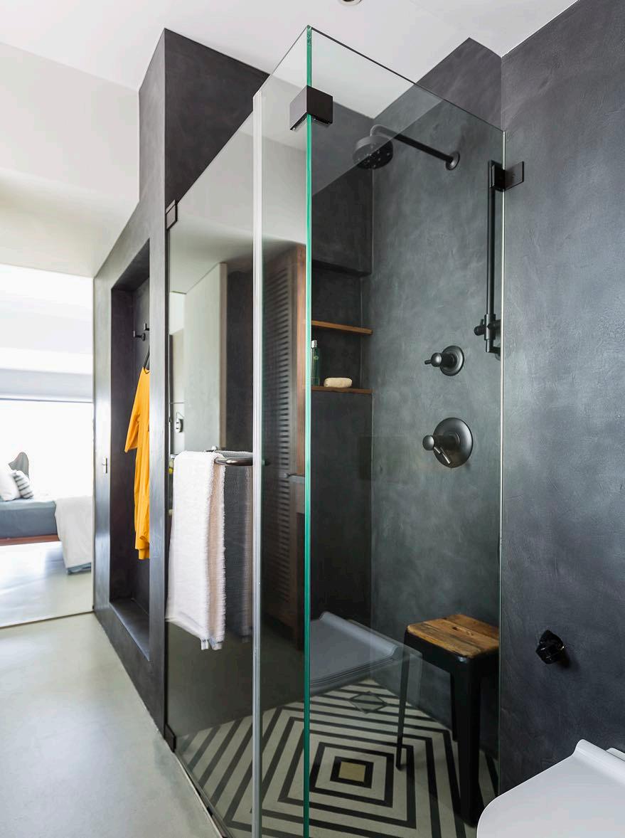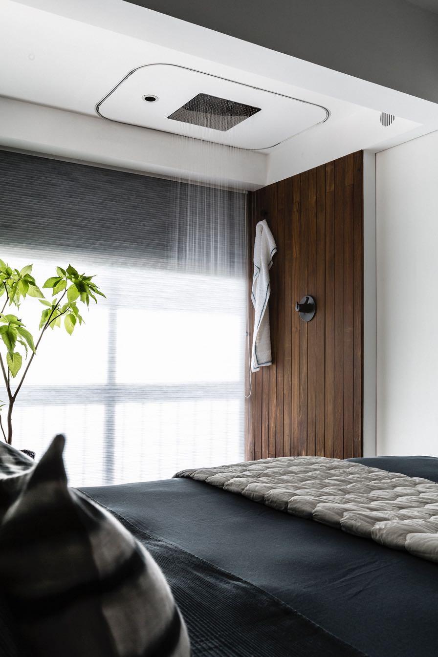 room. Indeed, one of the difficulties of this project was the size of the master bedroom. There wasn't enough closet space for the husband and wife, so the designer had to expand the bedroom to create a new one. Both the master bedroom and bathroom has a cozy atmosphere with shades of gray