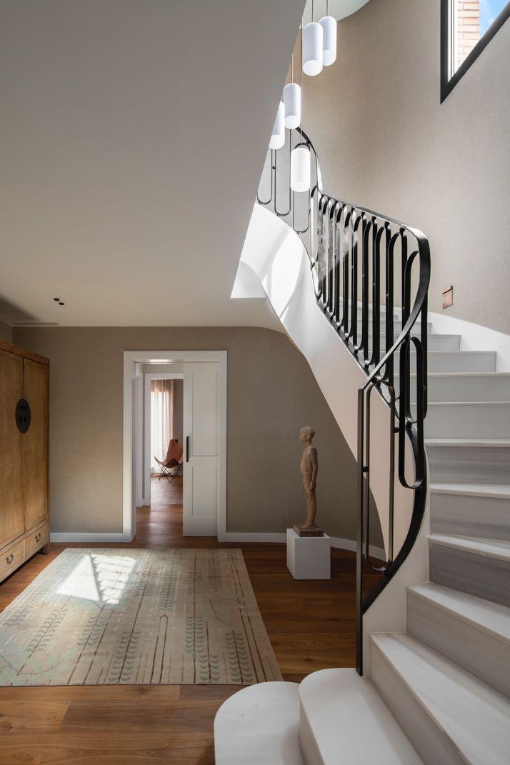 colors. An arrangement was made in the spacious hall and distributor of the house where the sculptural staircase is located, which was designed and made to measure with artwork of Victor Lope's Gallery. It was completed with a technical and decorative lighting project, obtaining different environments throughout the entire building controlled through a fully integrated home automation system The day area was located on the facade with more natural light to enjoy more hours of sunshine. All areas are connected so that the dialogue between them is not broken and away from their compartmentalization. On the one hand, we find the living room area where the fireplace is the center of the space and, on the other, the dining room where you can enjoy meetings with friends and family; both differ due to the use of different different textiles in a harmonic way.