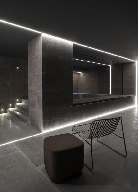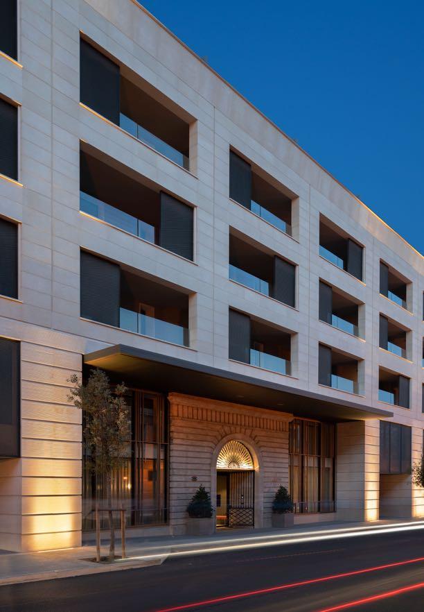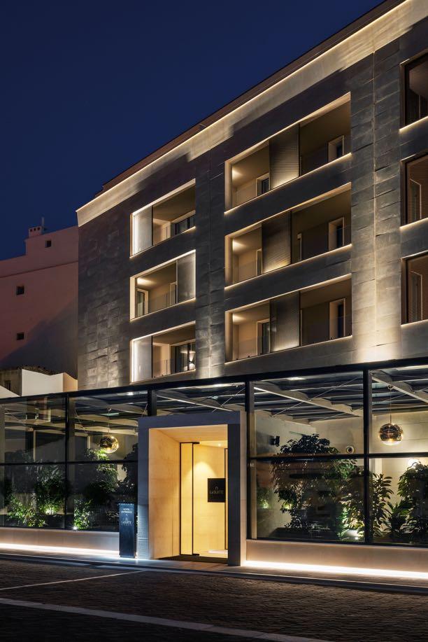 design is intuitively inspired by the twentiethcentury current of Italian rationalism, characterised by a lack of decorations to promote an authenticity that concretely integrates into the historical city. The uniqueness of this five-star structure lies in the synesthesia of aspects that pertain, on the one hand, to the social and urban fabric of the context, and on the other hand, to the analysis of contemporary stylistic trends, giving rise to a traditionally modern complex. The hotel is designed to offer an exclusive stay thanks to its formal fineness, the use of local materials and the renovation of an imposing arched portal of the 17th century, which characterises the entrance to the building with its strong presence. The symbolism of the arch, an archetypal element that reminds of the Tuff caves of the Civita, is just one of the many iconic elements that characterize this structure and create a line of continuity with the past Besides, the façade is marked by the juxtaposition of vertically arranged, chromatically calm lighting elements, which define a new, visibly homogeneous space with warm colours, in contrast to the intense light the city reflects naturally. An overall view of the fragmented façade is also offered by the rhythmic position of the Mazzaro slabs; it is a very resistant and performing type of Tuff, and it is also used as a traditional local covering material.