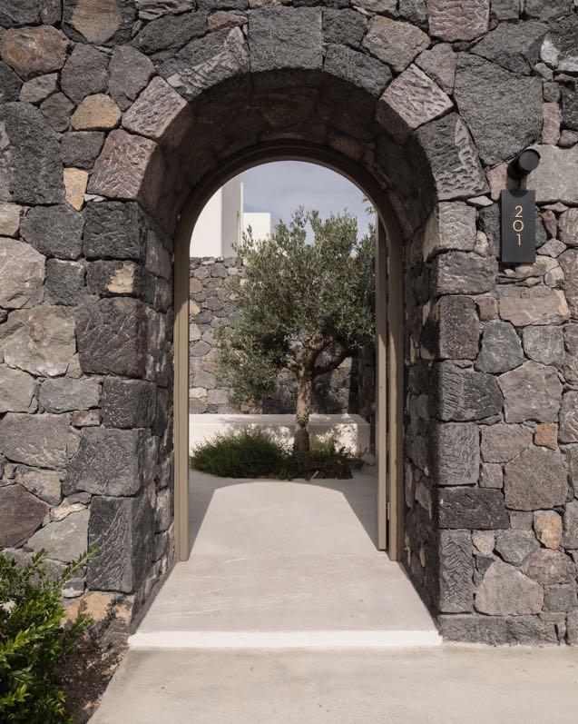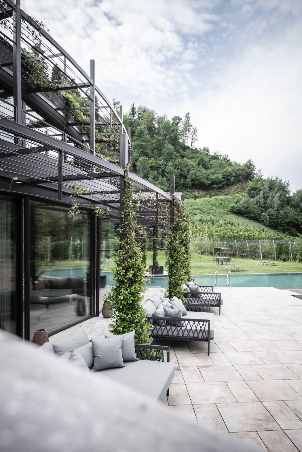 arrival the only hint of spaces that might lie inside is across a series of bonsai courtyards. The timber cladding of the new guest rooms, spa and pool area plays a game of shadows and creates a material landscape embedded in the green gardens while the uniting of the old hotel buildings with the new elements is a synthesis of architectural language with simplicity in materials to ensure that the senses are not overwhelmed. The language of the new adopts the symbolic traits of the historical buildings, recalling the proportions and character of the vernacular, expressed in a contemporary way, combining the organic with the geometric, all in chromatic harmony