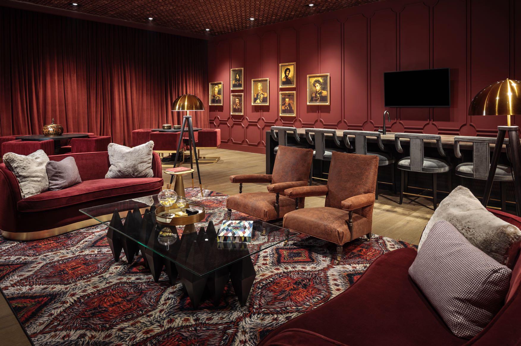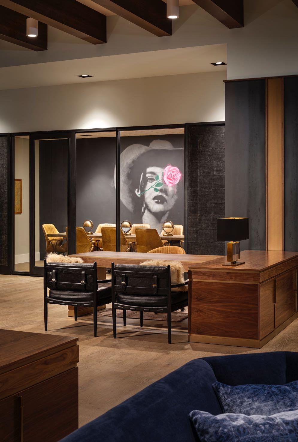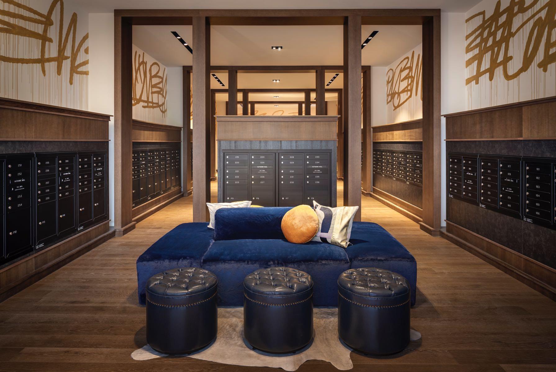 Tufted leather walls, custom millwork, and ruby drapes adorn the aptly named Ruby Lounge to create a sumptuous gathering space. A bold graffiti mural by artist Alic Daniel turns a mailroom into a gallery, with darker finishes and