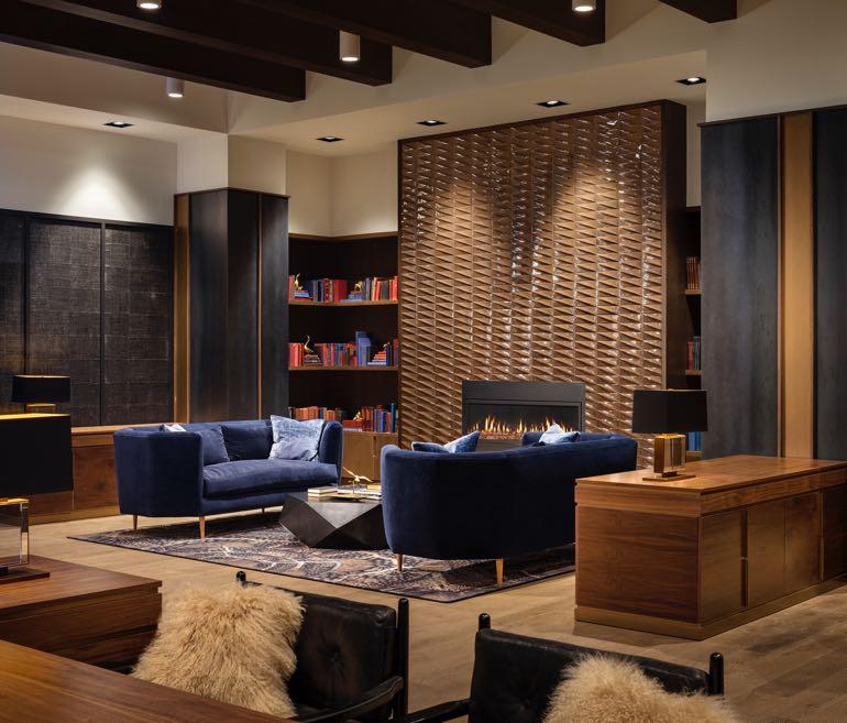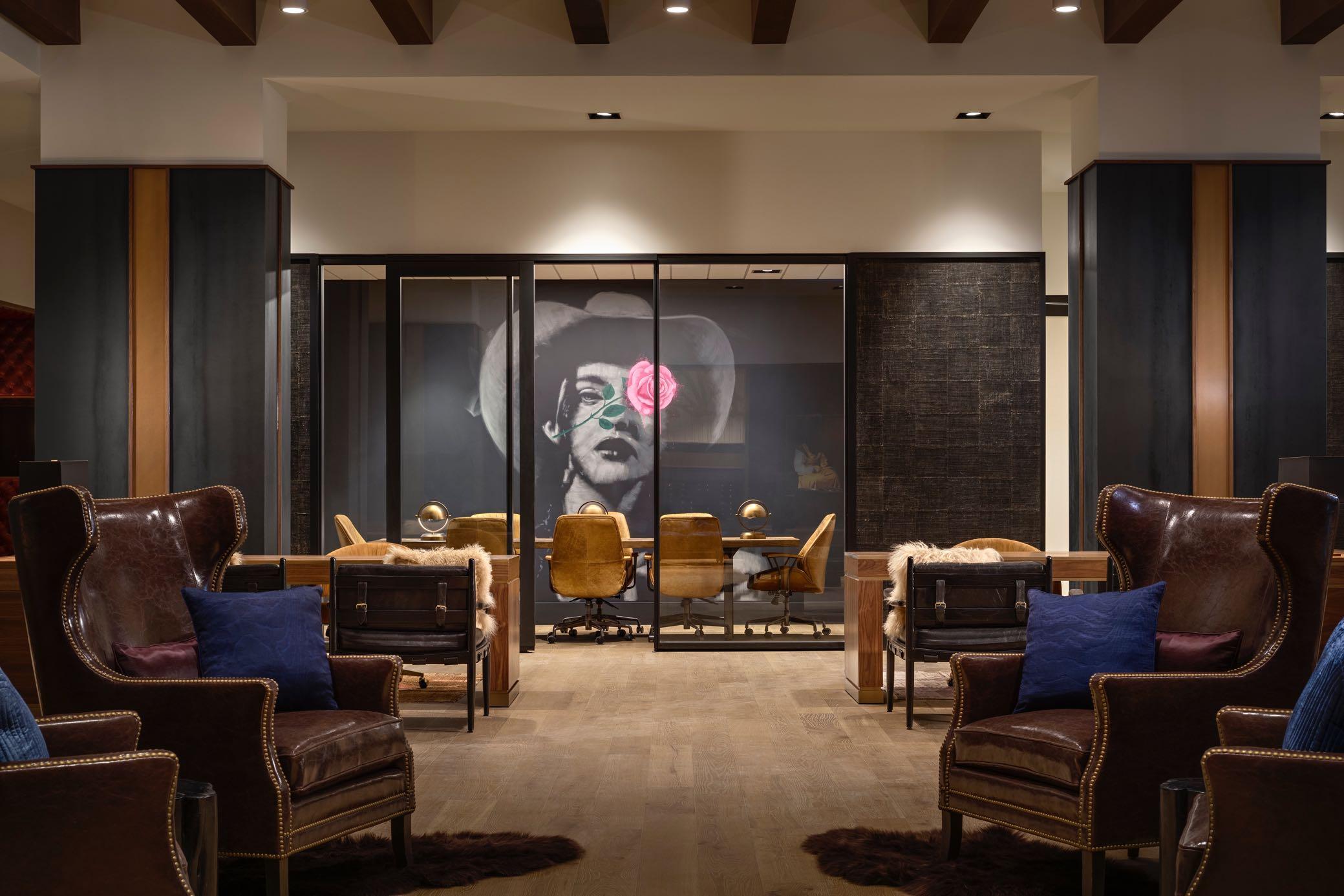 commissioned artwork by local artists, and an exterior glass feature with a dramatic tile mosaic spanning the full length of the 34-story tower. Jules Wilson Design Studio designed the common areas to be elevated, while functional. Custom sofas in jewel-toned velvet and a series of contemporary, Old Western-inspired murals by Nashville artist Brian Wooden welcome guests to the lobby.