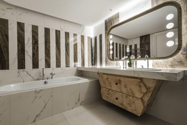 Bathrooms again echo the elegant marbles seen throughout the home, where French house Pierre Frey’s ‘Pampa’ print stylishly pulls the space together in a stunning and elegant finish