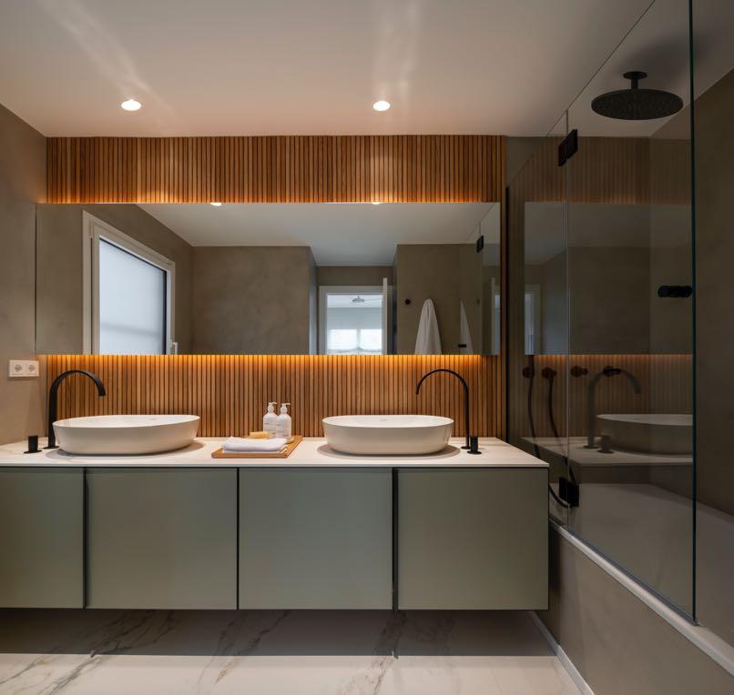 As a whole, a range of neutral and simple shades are used throughout the house These colors are prolonged in the materials used, choosing ceramic pieces for the design of the bathrooms, combining them with wooden paneling The timelessness and continuity in time of the elements introduced are sought.