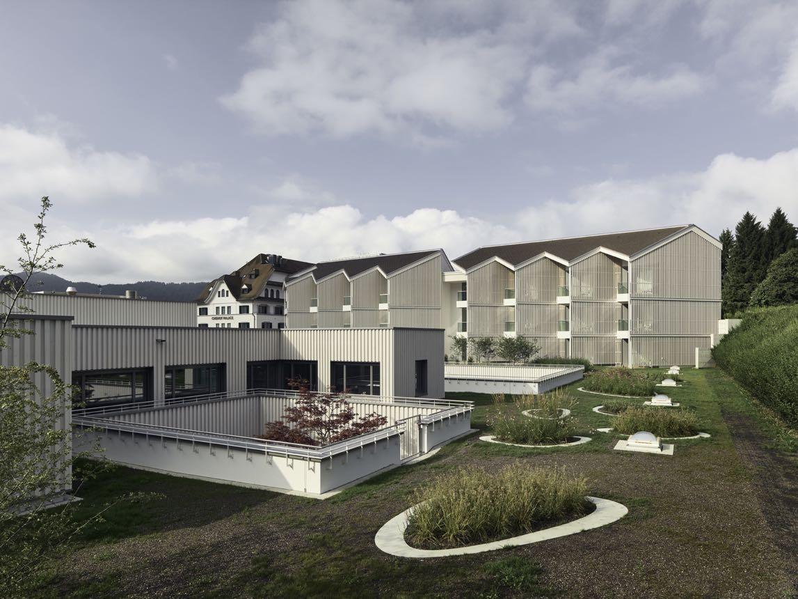 the-art medical spa and wellness area. The sensitivity and restraint of the intervention lies in reacting discreetly to the surrounding nature, it is an exercise in landscape. Upstream and east the scale of the volumes are reduced to create a dialogue with the existing residential urban fabric of the extension of the village, to the west and downstream towards the lake the buildings become the backdrop to nature. One of the aims was to preserve the appearance of the classic old hotel and to reinforce it by visually reducing the volume and the diversity of the architectural languages of the new individual buildings. Thus, the view of the property from the lake remains unchanged from before the new development; the new guest room building has been set back above the entrance and its volumes staggered in such a way that it is not ever fully visible. The spa volume is covered with gardens and on