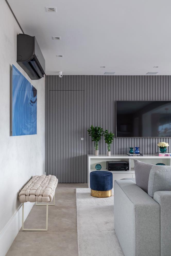 The winning point of the house is the living room that turned to be a large and comfort space to them enjoy the time and receive their family and friends. Monise Rosa had a chance to created a space with functionality and comfort. She also made a slatted panel behind the TV that serves both as a support and to camouflage the access door to the rooms