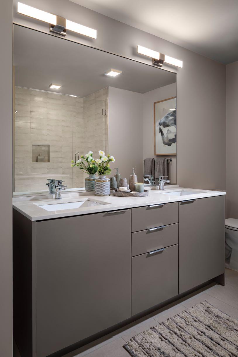 While a typical two-bedroom apartment in this context has two attached bathrooms and a common toilet, space is saved by allocating one attached bathroom between and accessible from two bedrooms. The functions of the second bathroom become independent and are separated into specific activities: showering, brushing, grooming and shaving. A rain shower with a view, a shaving sink, and a vanity cabinet with full length mirror are dispersed to specific locations in the bedroom which, when closed completely disappear. While freeing up space it also allows for multiple activities to take place simultaneously in the daily routine