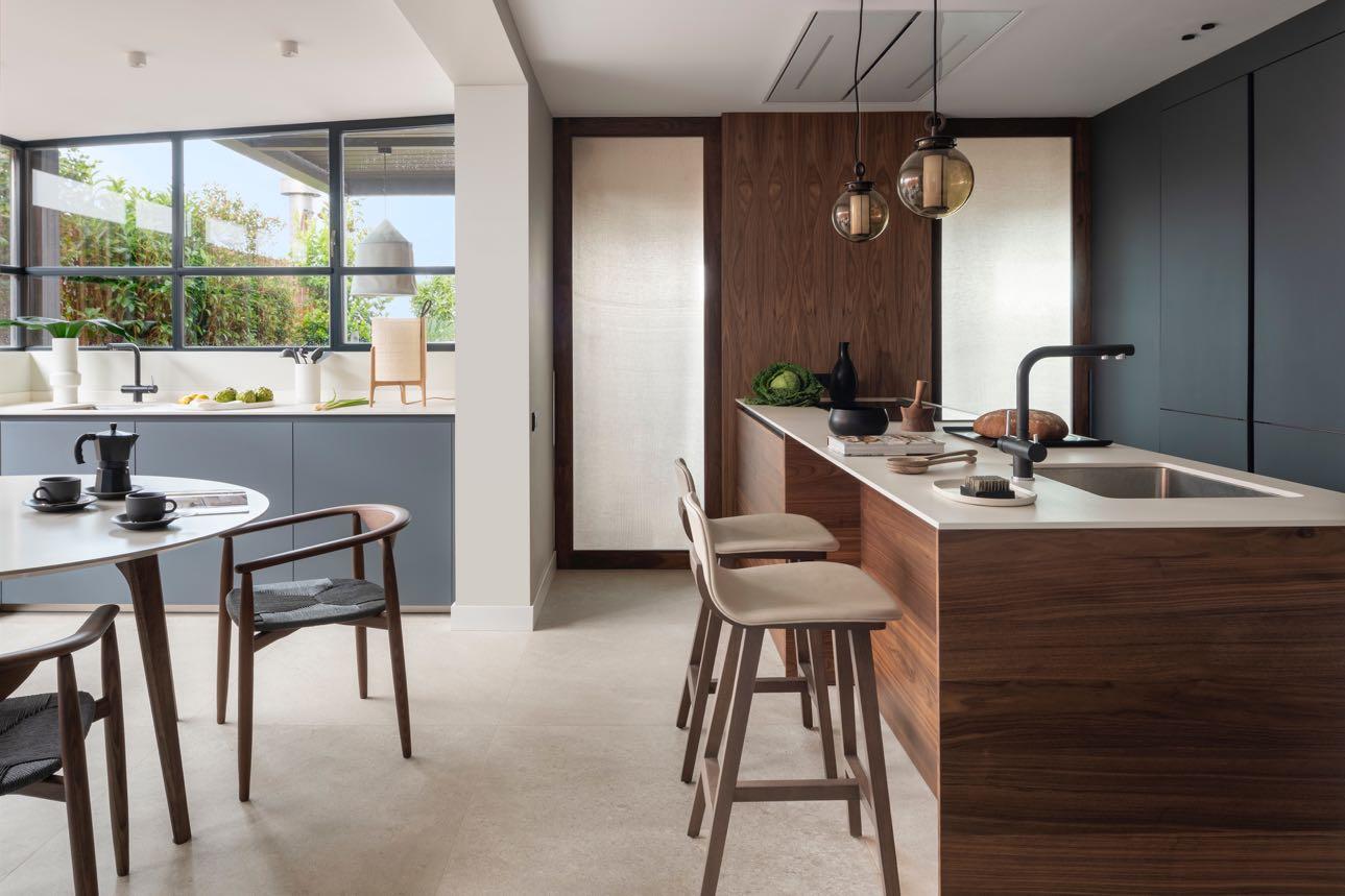 In the large custom-made kitchen, the aim was to obtain a space where the whole family could be together without losing sight of the outside. For this reason, an iron glazed area was designed for the breakfast area next to the large island and the small dining room where you can make more informal meetings.