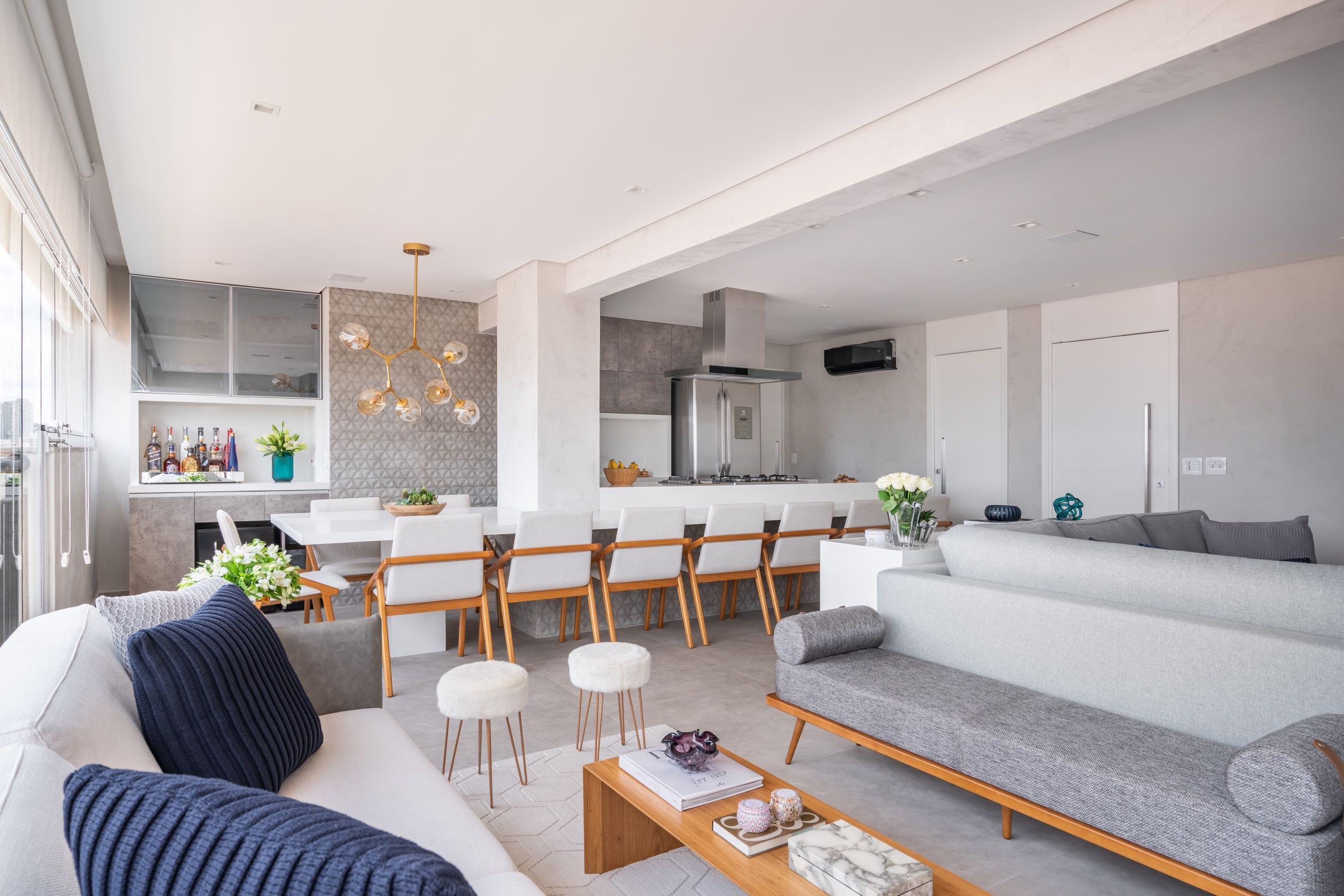 The palette of colors in this project is tones of grey, white, details in blue and a touch of wood in the furniture. As for the light, the designer opted both for natural light sources and the use of lamps. The project has a very large window thanks to which all natural light enters during the day While for the night, the designer added lightning spots and a lot of LED in the details to enhance the environment
