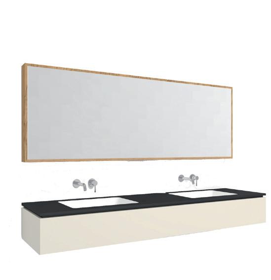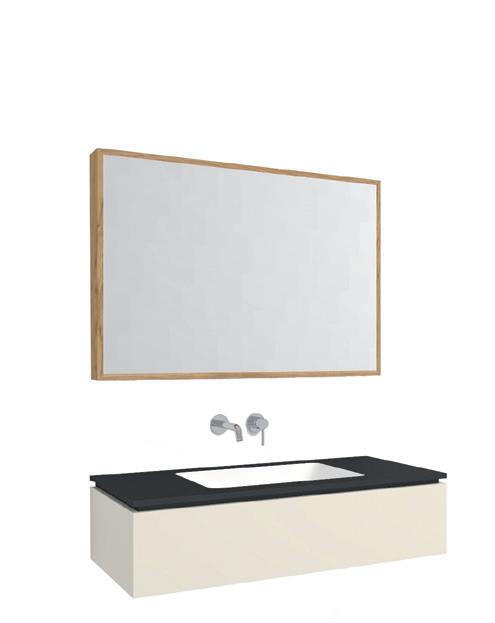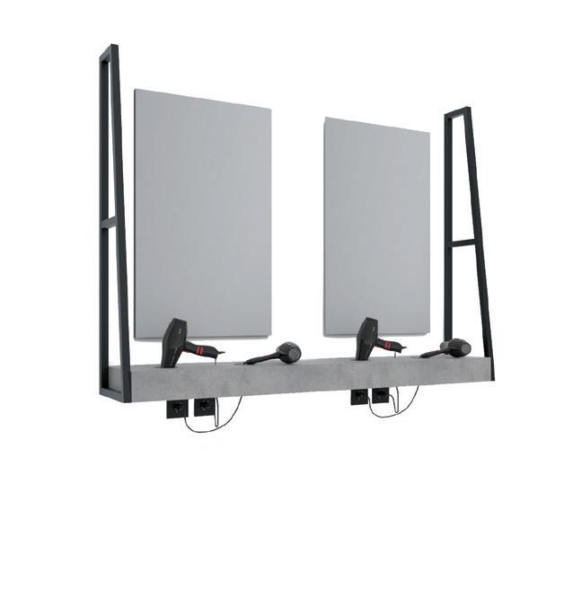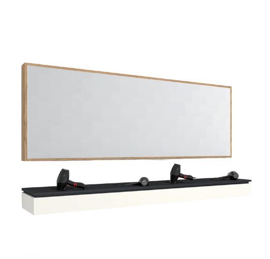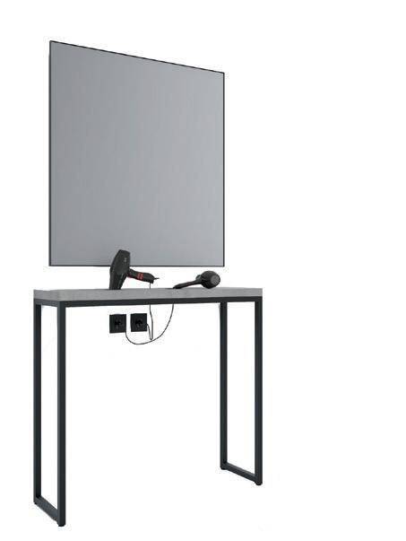Industriellt inspirerat sminkbord som överträffar även de mest krävande medlemmarnas förväntningar. En spegel och ett hyllplan i högkvalitativt laminat med en ram i pulverlackerad metall, tillgänglig i alla RAL-färger. Hängs stilrent upp antingen mot en vägg eller på sidan av en skåpmodul.