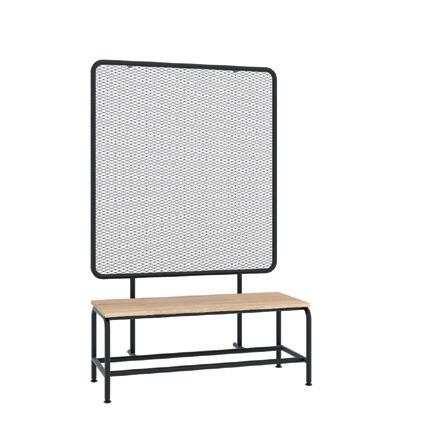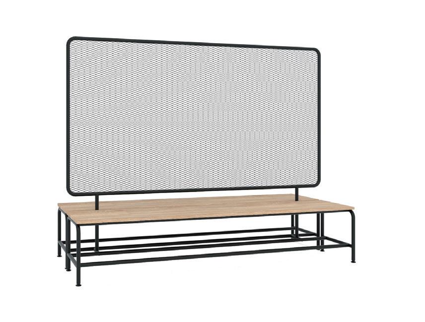Enkel och minimalistisk bänk som passar i stort sett vilket omklädningsrum som helst. Ramen är konstruerad av metallprofiler 25 x 25 mm, pulverlackerad och tillgängliga i alla RAL-färger. Sätet är gjort av högkvalitativt laminat. Utvalda modeller finns tillgängliga med en extra, expanderad metallnätsavdelare.