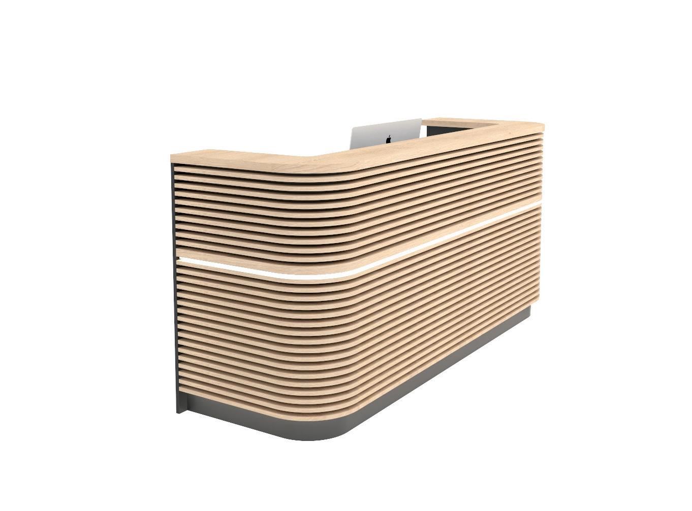 En rundad receptionsdisk med horisontella, dekorativa ribbor av laminat och med LED-belysning. En originell möbel för en djärvare interiör.