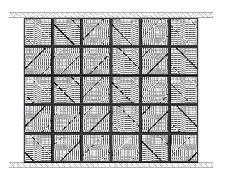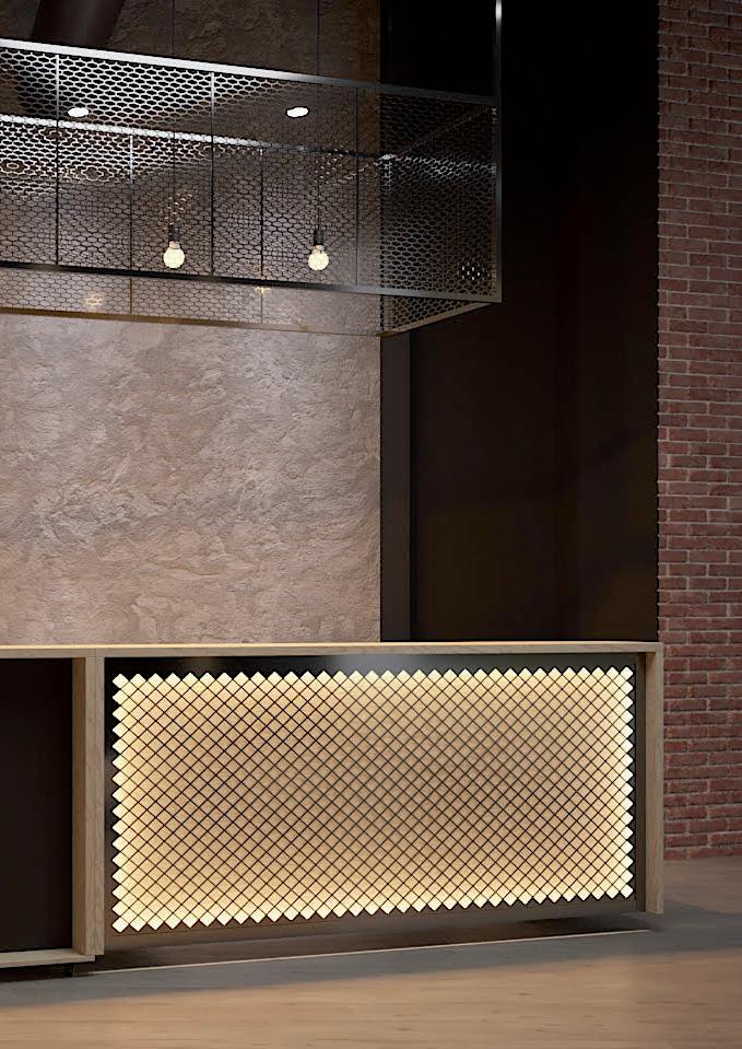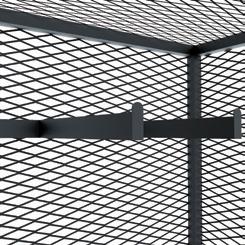 Enkel design men med en djärv kombination av högkvalitativ laminat och pulverlackerade expanderade metallnät. En smart struktur som tillåter för vilken utformning som helst, enkelt anpassat efter tillgänglig yta.