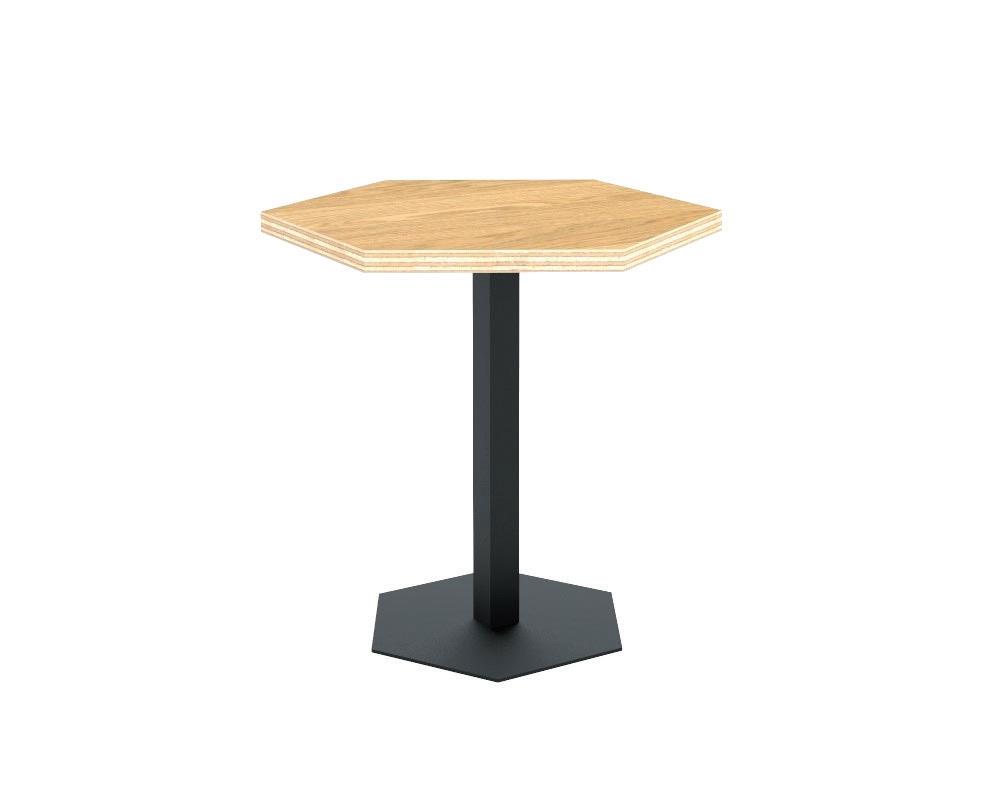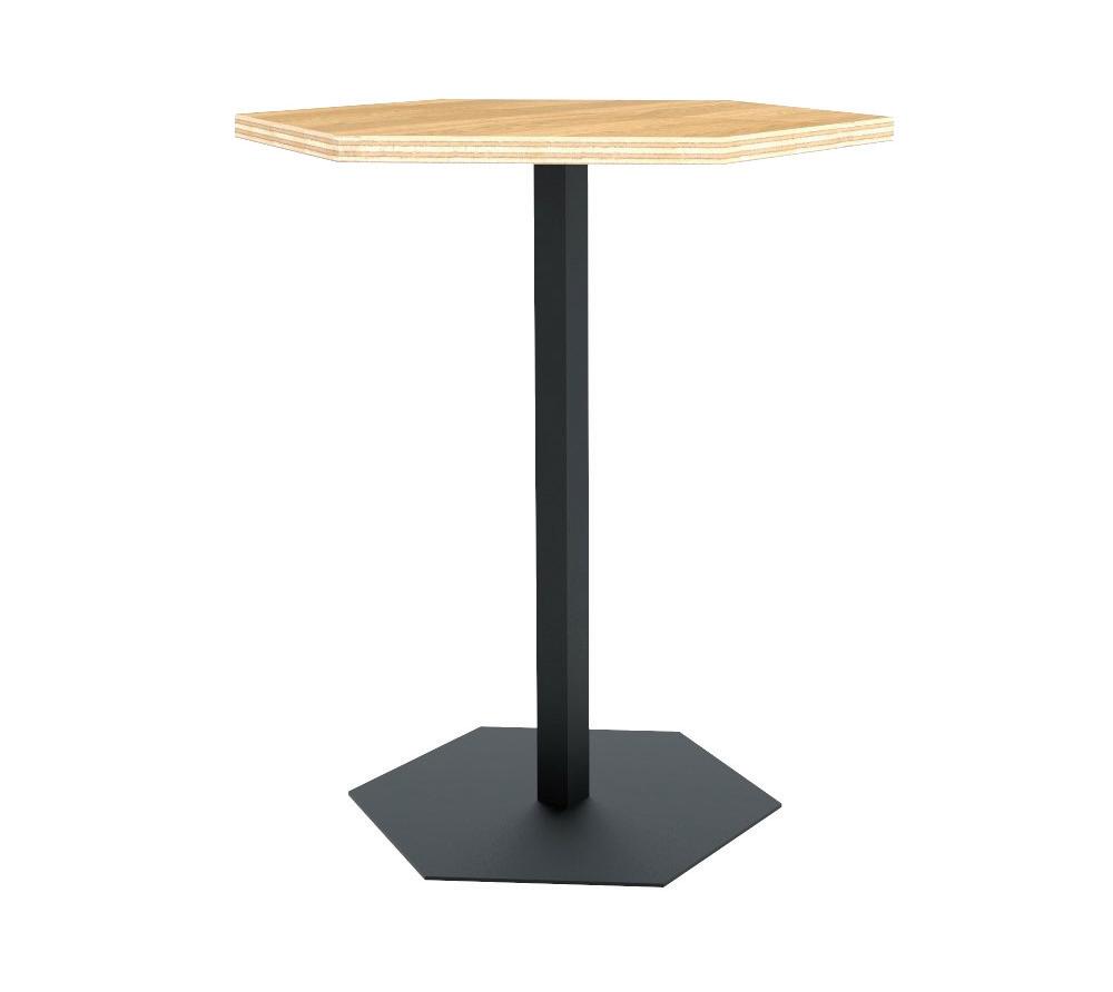 Hexagonformad skiva i fanerad plywood med matchande ben i stål, pulverlackerade och tillgängligt i samtliga RAL-färger. TABLES