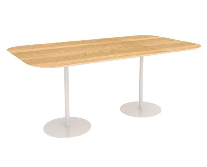 En skiva av fanerad plywood med rundade hörn och ett runt ben i stål, pulverlackerade och tillgängligt i samtliga RAL-färge. TABLES