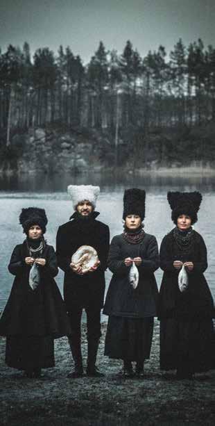The quartet includes: Marko Halanevych, vocals, darbuka, tabla, didgeridoo, accordion, trombone; Iryna Kovalenko, vocals, djembe, bass drums, accordion, percussion, buhay, zhaleika, piano; Olena Tsybulska, vocals, bass drums, percussion, garmoshka (Tsybulska is a specialist at the folklore department of the National University of Ukraine); Nina Garenetska, vocals, cello, bass drum. Vladyslav Troitskyi, director, ideologist, and founder, rounds out the group.