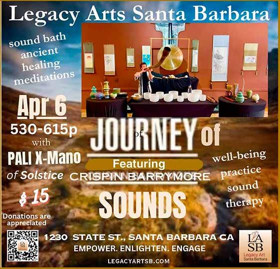 • 805-962-8885 • www.waterhousegallery.com WATERHOUSE GALLERY SB: Notable CA & National Artists • La Arcada Ct, 1114 State St, #9 • 11-5 Mo-Sa • 805-962-8885 • www.waterhousegallery.com WESTMONT RIDLEY-TREE MUSEUM OF ART: Senior Graduate Exhibition: In Between Moments ~ May 4; Traditional Hopi Katsina Dolls ~ May 4 • 805-565-6162 • Mo-Fr 10-4; Sat 11-5 • www.westmont.edu/museum April 5, 2024 Local News for a Global Village | www.VoiceSB.com 27 Artists: See your work here! Join VOICE Magazine’s Print & Virtual Gallery! An Affordable Advertising opportunity (just for Artists) To find out more, email Publisher@VoiceSB.com Art Venues CONTINUED 1ST THURSDAY • Downtown Art & Cultural Evening • Multiple Venues • www.DowntownSB.org • Free • 5-8pm Th, 4/4. OPENING RECEPTION • SBVA Featured Artists @ 2nd Fridays Art at SB Tennis Club • Meet the artists • Free • 4:30-6pm Fri, 4/12. RECEPTION: SAWLEAF – TWO MAN EXHIBITION • Showcase of 10 West Gallery artists Michael O’Guinn and Dan Nimmo • Helena Mason Gallery, 48 Helena Ave. • Free • 5-9pm Sa, 4/13. STUDIO SUNDAY • Watercolor architectural scenes • SB Museum of Art, Family Resource Center • Free • 1:30-4:30pm Su, 4/14. SB ARTS & CRAFTS SHOW • Local artists & artisans • Free • 236 E Cabrillo Blvd • 10-5 Su. CARPINTERIA CREATIVE ARTS • Shop locally made pottery, beach art, cards, jewelry, and sewn articles • 8th St & Linden Av • Free • 2:30-6 Th. Art Events 1st Thursday Reception with the Artist April 4th, 5 to 8pm Hours: Mon-Fri 10-5:30, Sat & Sun 1 to 5 www.VoiceSB.art Rhapsody / Chromatic Sonatas in Major and Minor Keys PAMELA BENHAM April 4th - 28th