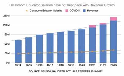 the Board meetings. We are called to bridge the gap between struggling families and mental health services. The increased, near superhuman levels of responsibility led to a surge in teacher anxiety, compounded by the reality that neighboring districts pay much more. In fact, in a comparison of school districts in Santa Barbara and Ventura Counties, SBUSD ranks 26th. I have witnessed a mass exodus of young, talented teachers who have left the profession or moved to higherpaying districts. They continue to leave because their salaries aren’t commensurate with the cost of living here. The district remains unmoved by teachers who chose this profession to make a difference and who work hard to not just educate, but to save lives.