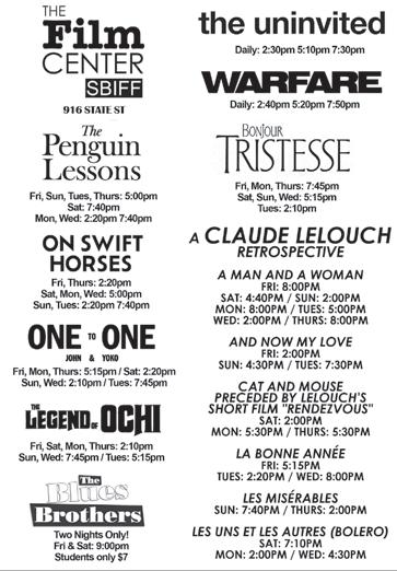 18. SBIFF’s Santa Barbara Filmmaker Series • SBIFF's Film Center, 916 State Street • Featuring Jonathan Coronado, Ryan Grant, Jade Ipiña, and Catherine Scanlon’s quwa’. The once-inhabited quwa’ island thrived where the Santa Barbara Airport now stands, unveiling striking historical uncoverings and Land Back discussions. Showtimes 5pm, 6pm, 7pm. Runtime: 15 mins.