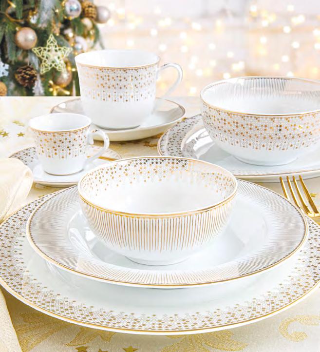 Il servizio Festive di Easy life riprende i canoni estetici classici della mise en place natalizia e li attualizza in una grafica contemporanea: in porcellana con rifiniture oro, illumina la tavola con un elegante motivo geometrico.