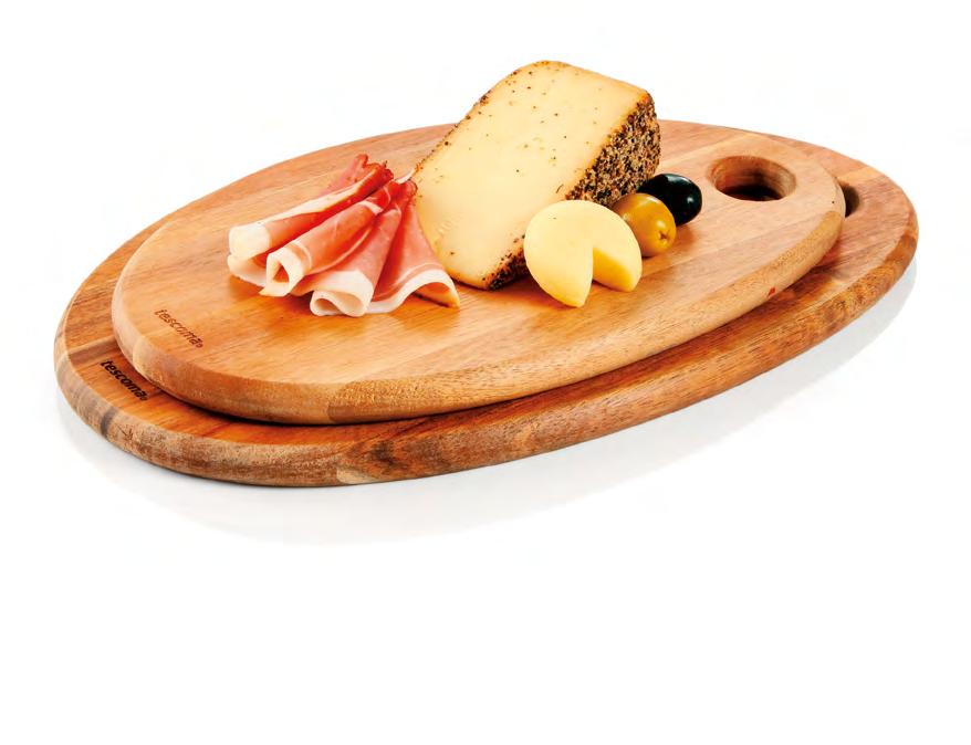Feelwood di Tescoma è un tagliere da portare direttamente in tavola. In legno di acacia, è resistente ed elegante, offre un’ampia superficie di taglio e, grazie al foro posto ad una estremità, è comodo come vassoio.