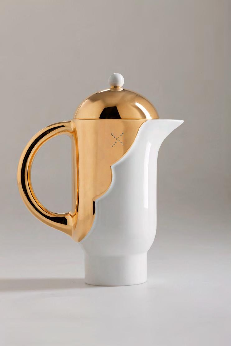 Bosa impreziosisce la caraffa in grès e smalto bianco lucido con decorazioni in nero e dettagli in oro 24 kt, applicati manualmente, in numerose varianti grafiche. Della stessa collezione anche piatti, tazze, ciotole e kit sale e pepe, tutto lavabile in lavastoviglie.