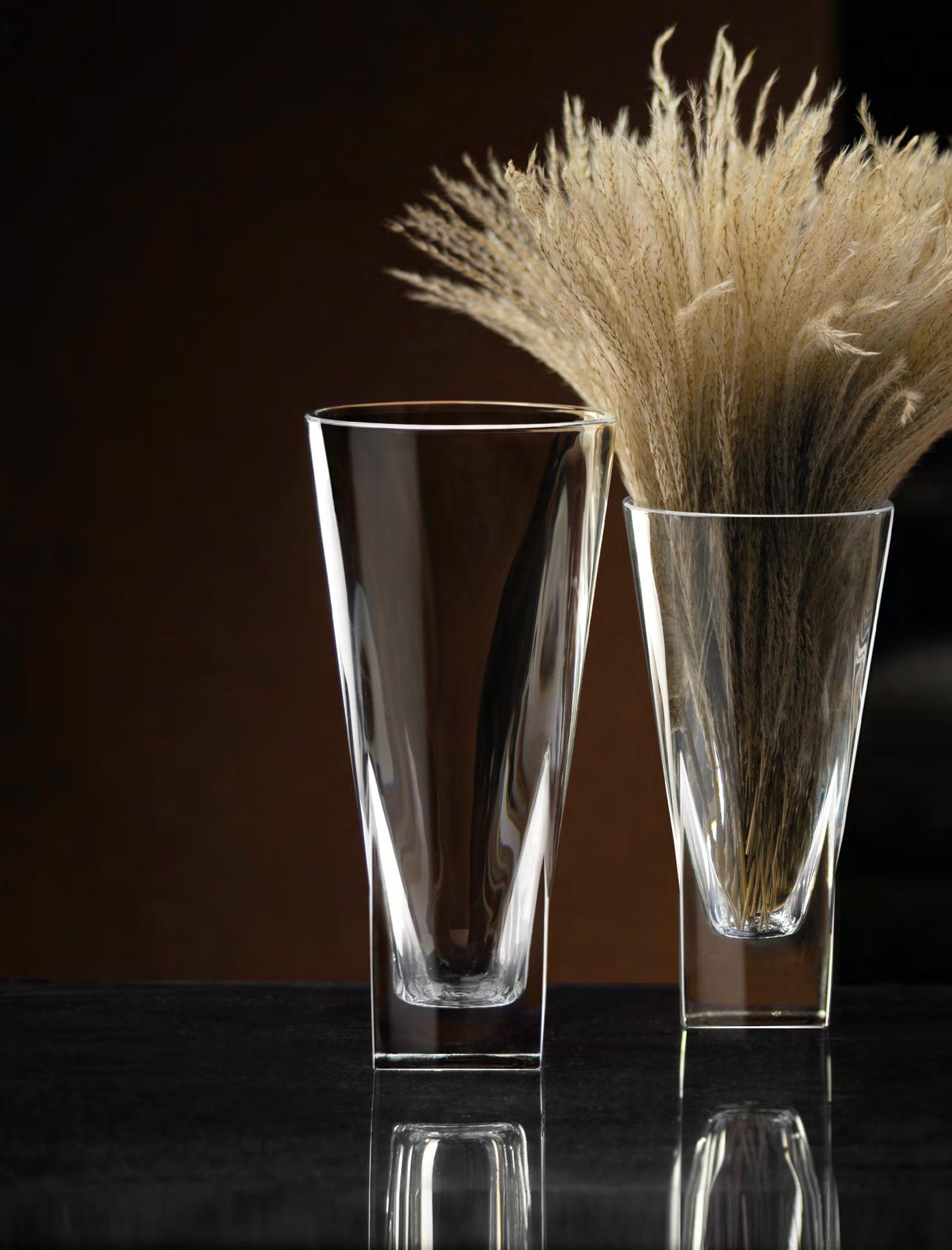 Geometrie rigorose per i calici in cristallo Laetitia di Arnolfo di Cambio, disegnati da Alberto Nason e Michele De Lucchi. Caratterizzati dal piede ultrapiatto quadrato, in equilibrio armonico con la coppa a cilindro, sono soffiati a bocca e lavorati a mano. In tre formati: acqua, vino e flute.