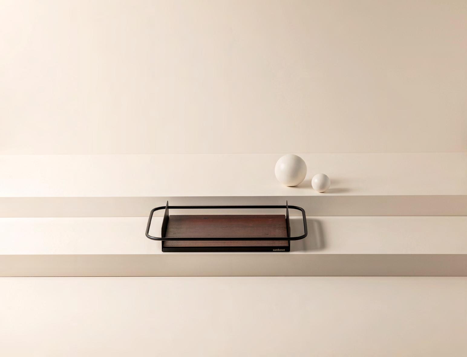 Essenziale e chic, il vassoio in acciaio inox verniciato Radici Home di Sambonet ha un inserto amovibile in legno di acacia, da usare come piano d’appoggio o centrotavola. Personalizzabile a piacere.