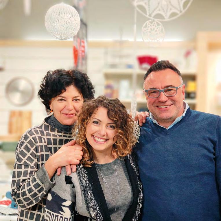 In alto, un evento culinario e un display natalizio del negozio Righini Casalinghi a Tavagnacco (UD). In basso, i Titolari Alessandra e Antonio Righini con la commessa del punto vendita.