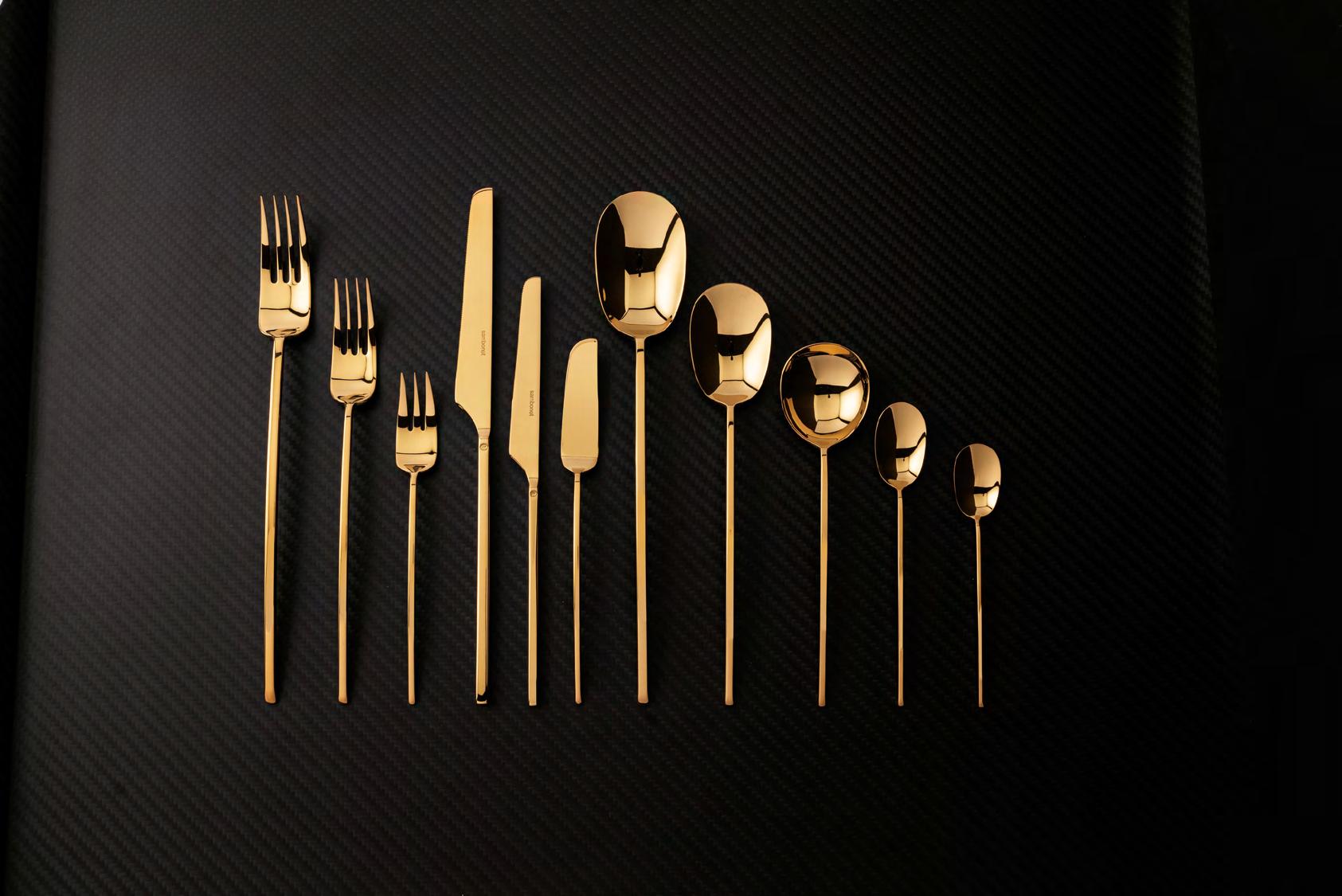 Le nuove posate 100 in acciaio inox, sono disponibili nella versione lucida e nella colorazione PVD oro (Physical Vapour Deposition, uno speciale trattamento che conferisce all’acciaio colorazioni e sfumature di tendenza). Il tutto racchiuso in un packaging esclusivo da 24 pezzi.