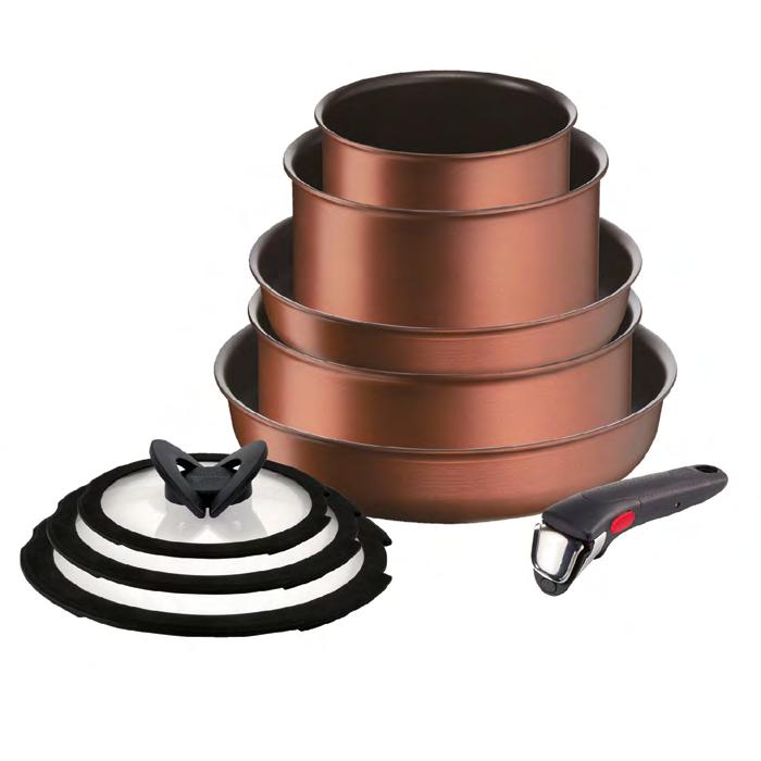 Un vero salvaspazio: le pentole antiaderenti Ingenio Natura di Lagostina sono dotate di manico removibile, sono impilabili e si possono utilizzare su piano cottura (anche induzione), forno, frigorifero o in tavola come piatti da portata. In alluminio 100% riciclato.