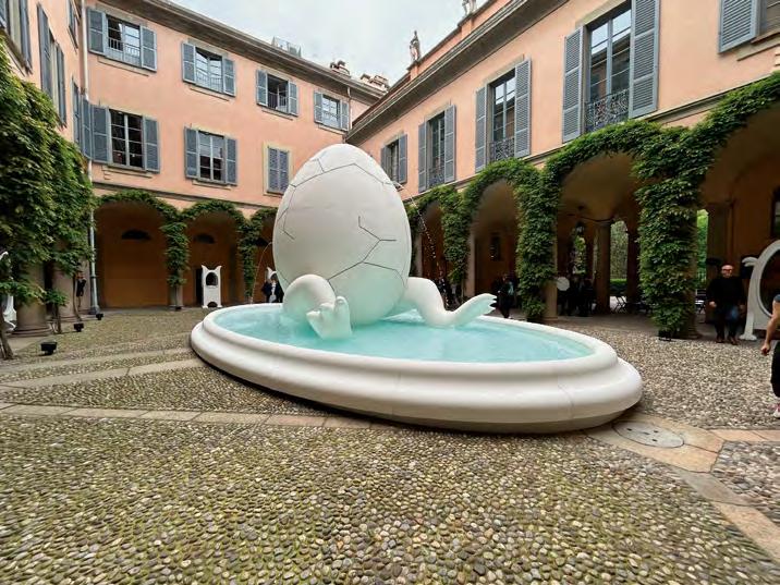 La fontana centrale, con l’acqua che rappresenta il lago, presenta al centro un drago. Ne vediamo la coda, le zampe che escono dal guscio ma non il volto che rimane avvolto nel mistero. Il drago è potenza così come è potente la forza creativa di Alessi che può creare, dall’impossibile, qualcosa di bellissimo.