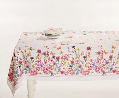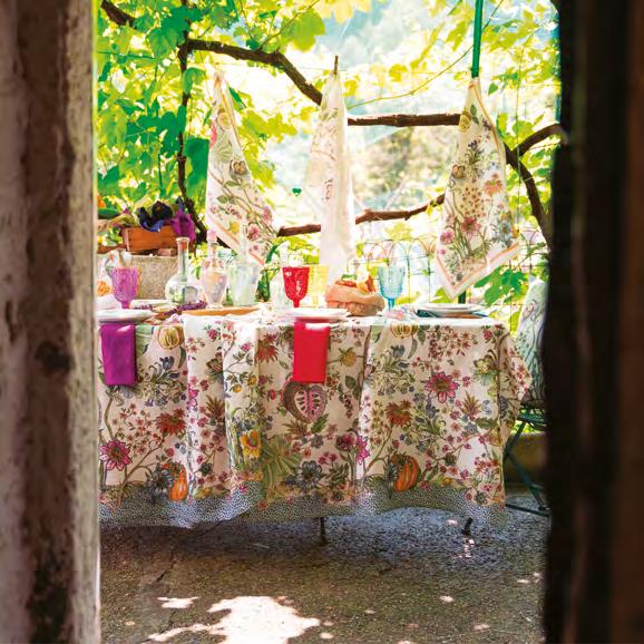 Flower, nuova tovaglia che Caleffi propone per la tavola all’aperto: una stampa floreale dal sapore bucolico per una convivialità informale e insieme sofisticata.