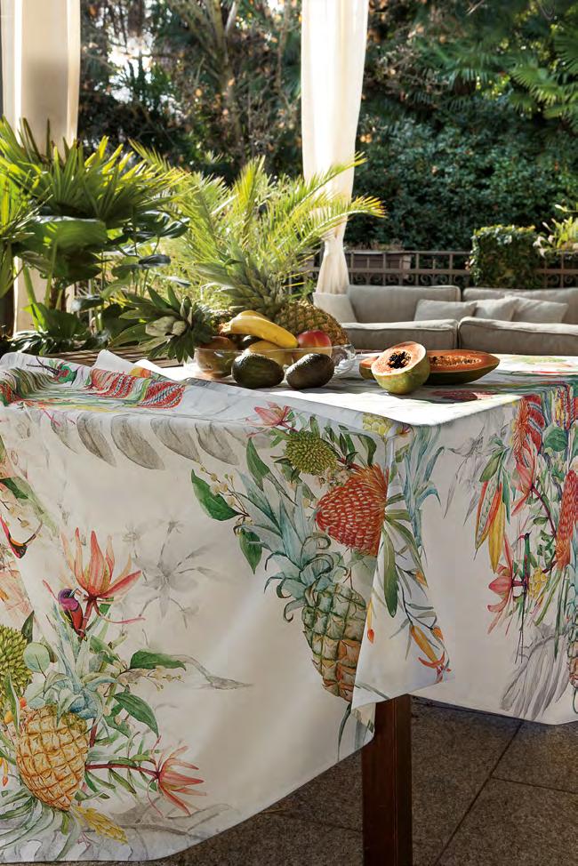soluzioni che profumano di fiori. Valga per tutti l’esempio di Caleffi, che ha appena presentato una serie di articoli per la mise en place sul balcone o in giardino, in grado di assecondare un’atmosfera rilassata, tempi dilatati ed un forte desiderio di convivialità. Con tali intenzioni il brand celebra i mesi primaverili ed estivi vestendo la tavola di tovaglie interamente Made in Italy che sanno raccontare storie di passione e socialità, così come – da sempre – la creatività ed il buon cibo accompagnano il vero Italian Style. Via libera, quindi, a decori con semplici girasoli, o bouquet di fiori di campo, oppure anche rigogliose orchidee e foglie tropicali per evocare sensazioni di benessere e condivisione