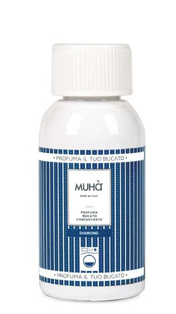 Muhà blends bergamot, peach, and Damask rose with hints of geranium, cyclamen, orchid, cedarwood, sandalwood, and musk to give garments a long-lasting and persistent fragrance. The Diamond laundry scent is a true concentrate of freshness.