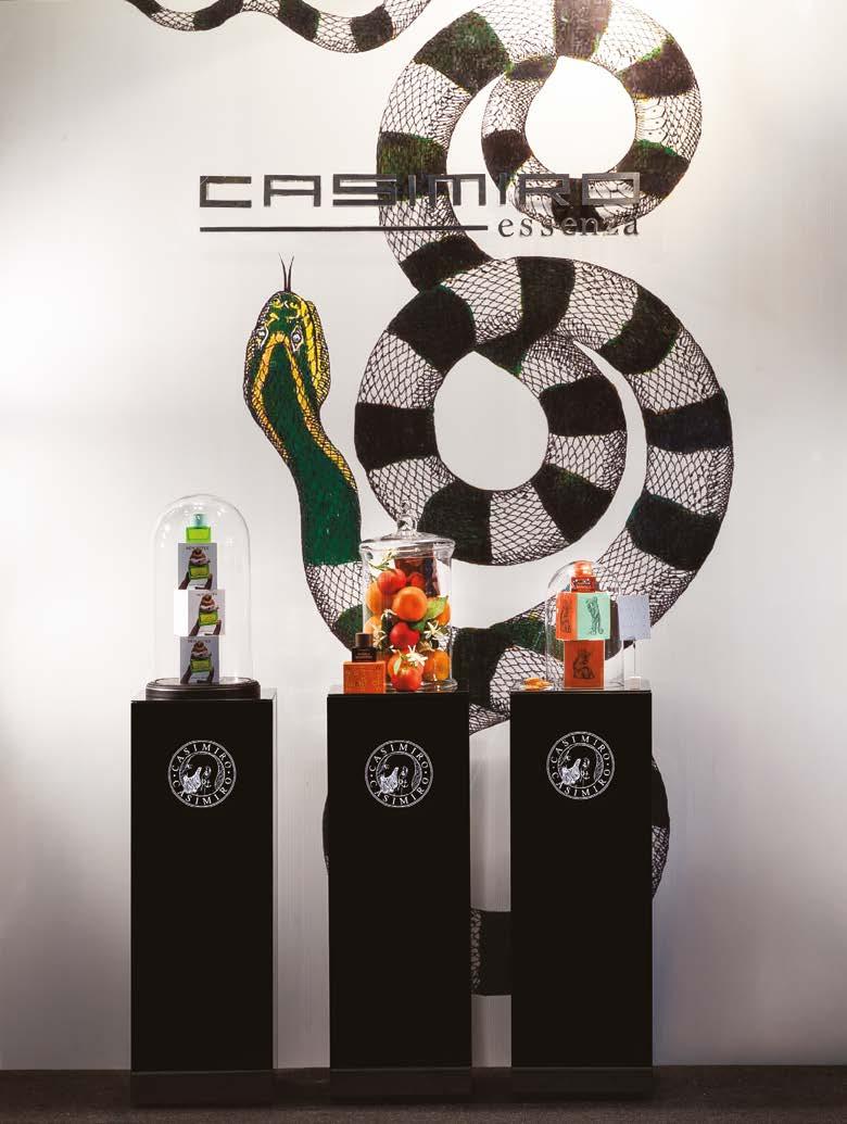 It was one of the rst things I created when I fell in love with perfumery. Cento per cento Casimiro is me—my vision of art and beauty, of a culture and lifestyle that thrives on weaving together different forms, disciplines, and inspirations. I developed a true olfactory logo that embodies my store’s philosophy. With my voice I tell the story of a scent journey, the shop windows bring it to life visually, and the fragrance completes the immersive experience.