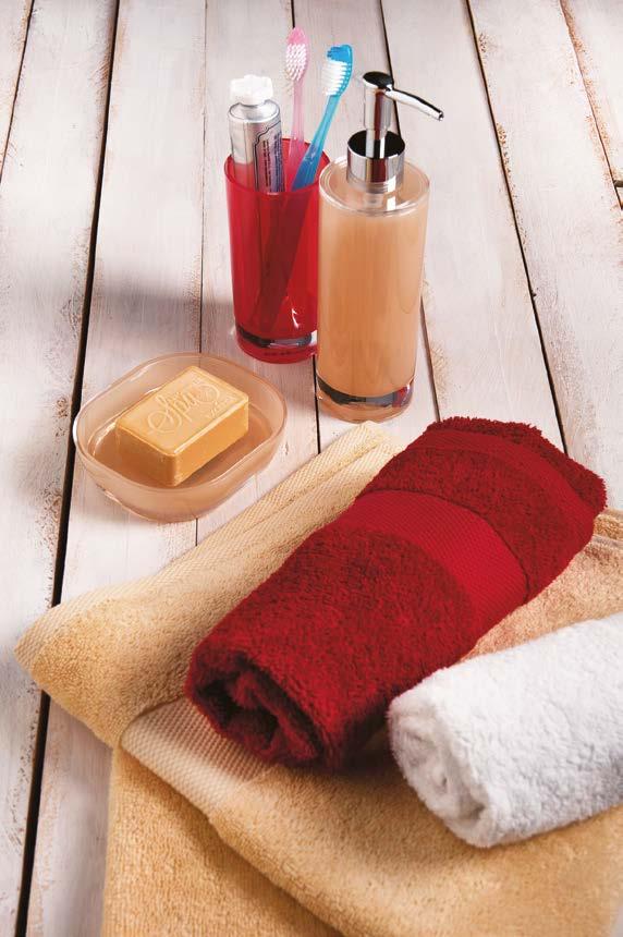 A wide range of colors—red, orange, yellow, pink, green, blue, beige, and white—can be perfectly matched with the new coordinated colored terry slippers for a fully harmonized bathroom look.