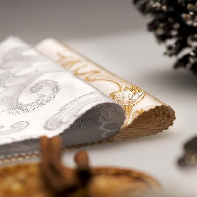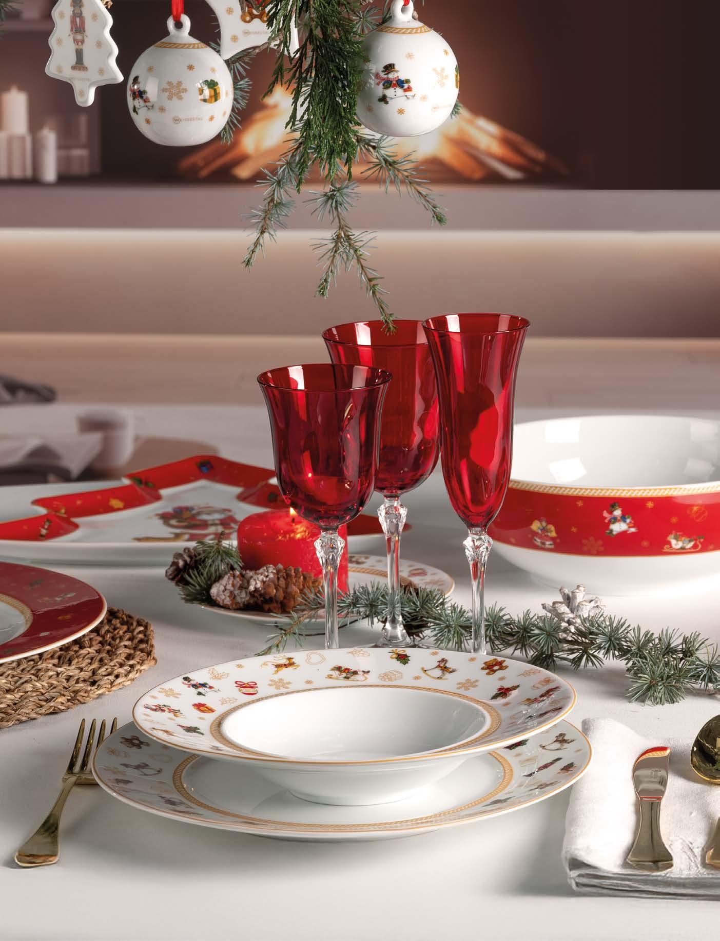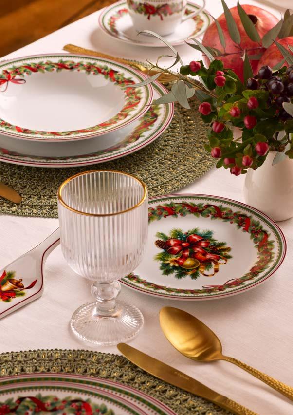 To create a Christmas flled with wonder, the harmony of tactile materials and refned color combinations becomes essential. Linen, with its distinctive weave, brings a sense of understated, authentic elegance to the table. The col-