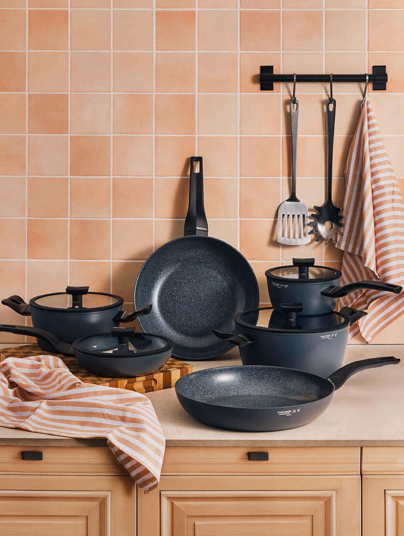 strong connection with the territory. Raw materials are carefully selected: aluminum is also sourced from recycled cans, bakelite handles are enriched with natural fllers, and external coatings are water-based. Production effciency is thus combined with transparent ethics, aimed at circularity and environmental responsibility. Since 2023, all new collections adopt Finegres®, Moneta’s latest technological evolution.