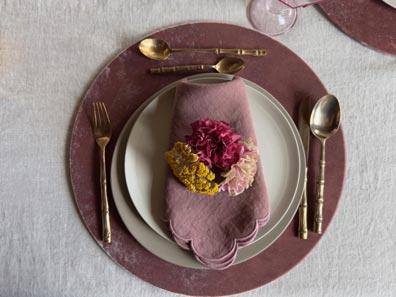 The new color chosen by Once Milano to warm up the autumn season is called Vintage Pink. Flirty yet warm and enveloping, it’s the perfect hue in its velvet version — used for tablecloth borders, individual placemats, and bedspreads.