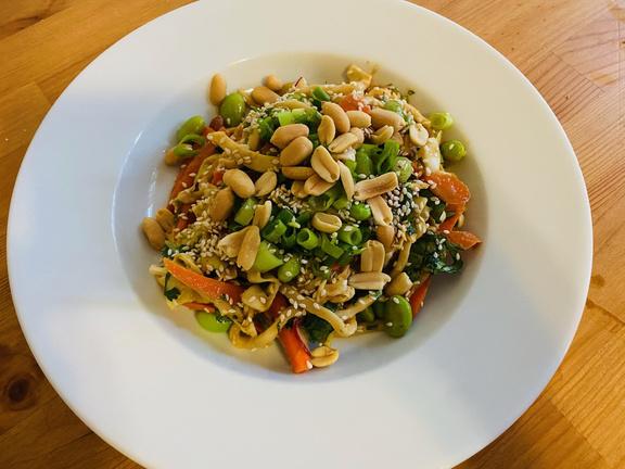 Then pour the peanut dressing over the hot noodles, so they can absorb the flavor properly