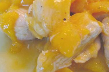 de água, deite nessa travessa e junte-lhe ocaldoKnorr.Envolvae,quandoofrango estiveralourado,deiteumpoucoparanão se pegar. Em seguida deite calda de tomate (cerca de 2 colheres de sopa). Envolvacomacolhere,àmedidaquevai vendoquenecessita,deitemaisumpouco da água do Knorr. Vá sempre que necessário,mexendo,paranãosepegar. Quandovirqueofrangojáestácozinhado, deiteacaldadopêssegoelogodepoisos pedaços cortados aos bocadinhos. Quandovirqueofrangoestápronto,´regue´ comoscoentrospartidosaosbocadinhos. Nota: Quem gostar, poderá deitar um poucodepicantenopreparado.