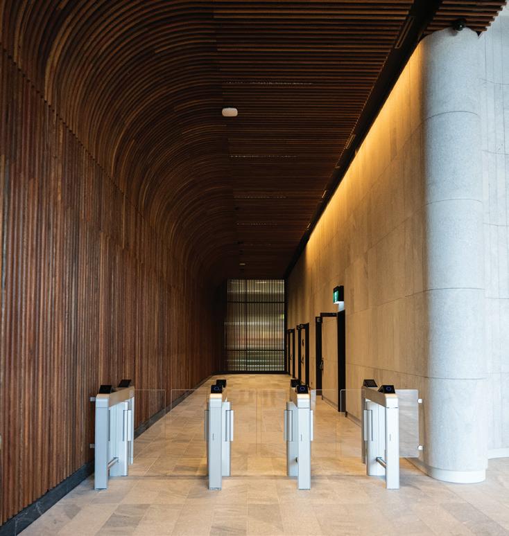Part of a new nine-storey A-Grade office tower in the Chadstone precinct, Casello supplied and installed Spotted Gum battens using the Sculptform Click-on Batten system. Works included a curved feature wall in the entry lobby and ceiling battens in the internal meeting pod.