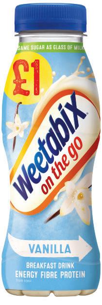 The Weetabix price-marked pack range covers a range of lines across its cereal and drinks portfolio, at a range of price points. These include £1 PMPs of Weetabix On The Go breakfast drink, which were brought back last year by popular demand, backed by a field sales campaign to increase distribution in the impulse channel.
