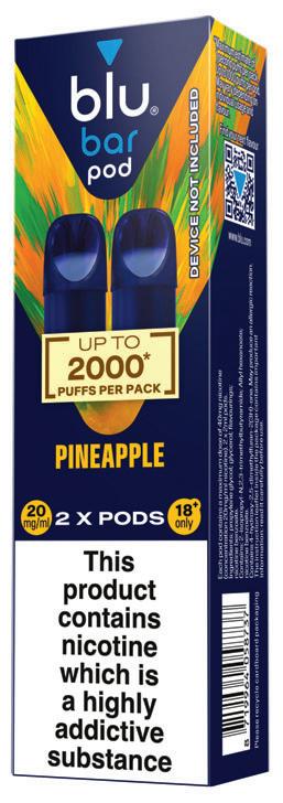 The kit contains a device and a pod in either Cherry or Pineapple flavour. Blu bar pod packs are also available, featuring two pods per pack in Cherry, Pineapple, Blueberry Sour Razz or Watermelon Ice flavours.