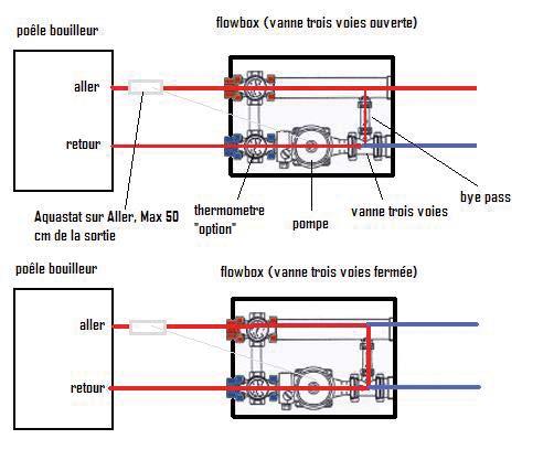Au départ, l’eau froide circule en circuit fermé aller - bye passretour. Le retour est bloqué à l’entrée du flowbox. Après plusieurs passages de l’eau dans le bouilleur en circuit fermé et que la température de l’eau arrive à 60°, la vanne 3 voies thermique s’ouvre graduellement le retour se débloque et l’eau chaude circule dans les radiateurs/ballon tampon. Lorsque la température diminue, le processus s’inverse.