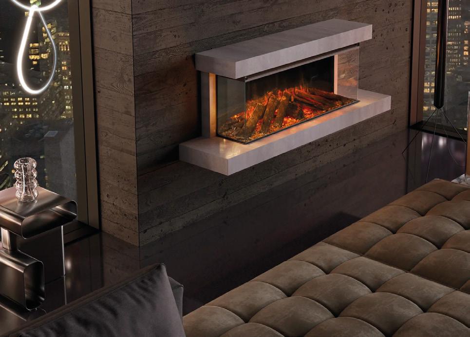 - Vitre panoramique : grande surface vitrée horizontale offrant une vue exceptionnelle sur le feu.