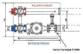Le kit flowbox se compose d’une pompe, d’une vanne trois voies thermique, d’un bye-pass, de deux thermomètres, de deux vannes à sphère (poignée bleu = froid, poignée rouge = chaud).