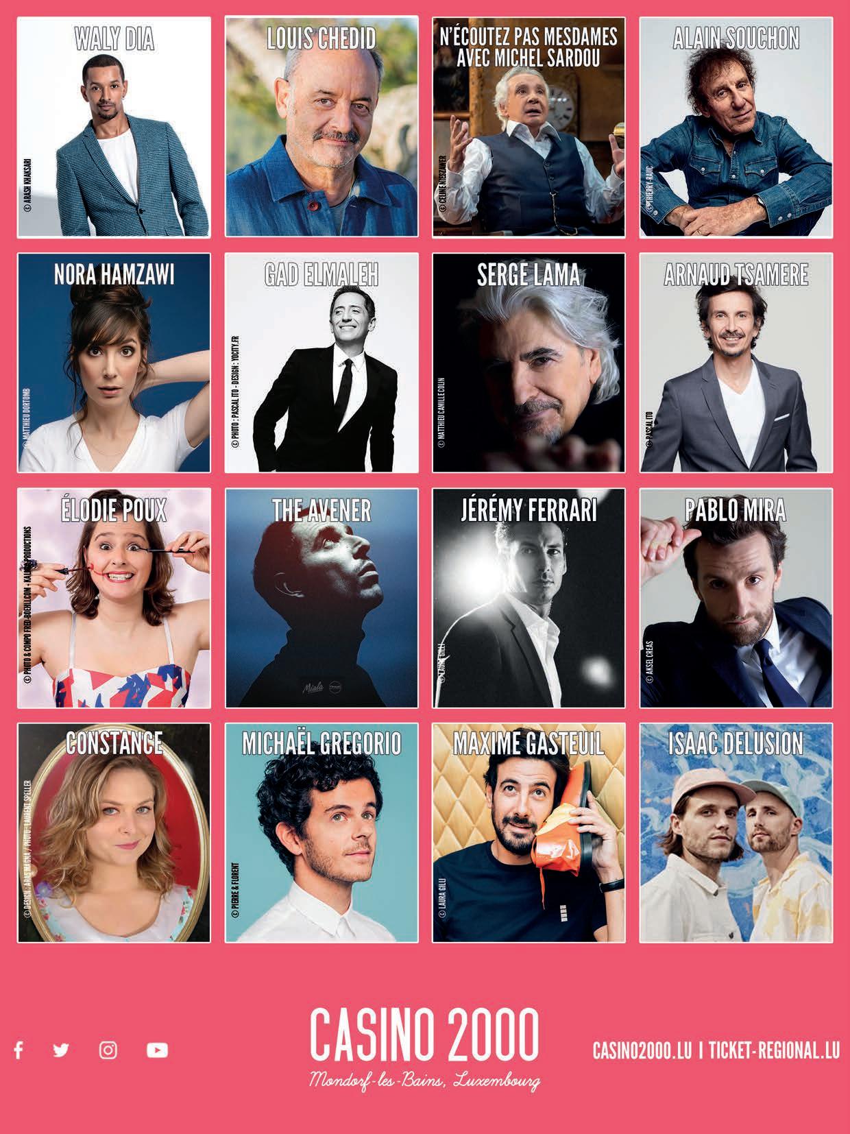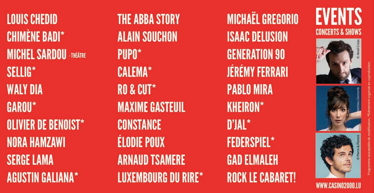 Le premier semestre 2021 vous promet des soirées mémorables ! Une belle programmation vous attend avec des poids lourds de la chanson française tels que Louis Chedid, Serge Lama ou encore Alain Souchon. Rendez-vous sur notre site Internet pour plus d'infos ! www.casino2000.lu